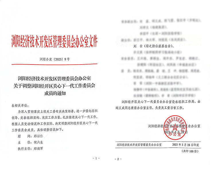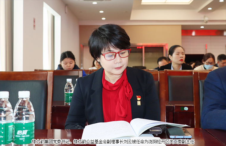 會(huì)上,瀏陽經(jīng)開區(qū)黨工委委員、管委會(huì)副主任、關(guān)工委主任何六生主持會(huì)議。瀏陽經(jīng)開區(qū)組織工作局局長(zhǎng)、關(guān)工委常務(wù)副主任宋孟宣讀瀏陽經(jīng)濟(jì)技術(shù)開發(fā)區(qū)管理委員會(huì)《關(guān)于調(diào)整瀏陽經(jīng)開區(qū)關(guān)心下一代工作委員會(huì)成員的通知》,綠之?集團(tuán)黨委書記、綠之韻公益基金會(huì)副理事長(zhǎng)劉云被任命為瀏陽經(jīng)開區(qū)關(guān)工委副主任。