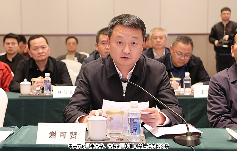 會(huì)議最后,中共安化縣委書記石錄明講話。他首先代表縣委、縣人大、縣政府、縣政協(xié)和103萬父老鄉(xiāng)親對(duì)出席會(huì)議的各位鄉(xiāng)友、各位企業(yè)家表示熱烈的歡迎,對(duì)大家一直以來心系故里,不遺余力地支持家鄉(xiāng)發(fā)展表示衷心的感謝。近年來,在中央、省、市的堅(jiān)強(qiáng)領(lǐng)導(dǎo)下,在社會(huì)各界的支持幫助下,安化始終堅(jiān)持統(tǒng)籌發(fā)展和安全,全力辦好發(fā)展經(jīng)濟(jì)這個(gè)最大實(shí)事,堅(jiān)定不移走生態(tài)優(yōu)先、綠色發(fā)展之路,用心用情用力增進(jìn)民生福祉,全面建成了小康社會(huì),順利摘掉了“國貧縣”的帽子,成功創(chuàng)建國家衛(wèi)生縣城、全國生態(tài)文明建設(shè)示范區(qū)、全國“三茶統(tǒng)籌”先行縣、省文明城市、省平安縣,經(jīng)濟(jì)社會(huì)發(fā)展實(shí)現(xiàn)了穩(wěn)中有進(jìn)、進(jìn)中向好。他表示,如今的安化,是一個(gè)政策集成、機(jī)遇疊加的新安化;是一個(gè)產(chǎn)業(yè)興起、活力迸發(fā)的新安化;是一個(gè)經(jīng)促聯(lián)誼、匯聚合力的新安化。廣大鄉(xiāng)友是家鄉(xiāng)發(fā)展和建設(shè)的重要組成部分,也是推介安化不可或缺的中堅(jiān)力量,地位舉足輕重、作用十分重要,希望在外的廣大鄉(xiāng)友能夠當(dāng)好宣傳員,積極宣傳來安發(fā)展的優(yōu)勢和機(jī)遇,幫助家鄉(xiāng)做大“朋友圈”,讓更多的人了解安化、走進(jìn)安化、投資安化;當(dāng)好家鄉(xiāng)建設(shè)發(fā)展的指路人、對(duì)外開放的牽線人、社會(huì)事業(yè)的熱心人、投資興業(yè)的帶頭人,共同把安化建設(shè)得更加美好。安化縣委縣政府鼓勵(lì)重視和支持鄉(xiāng)友發(fā)展的決心堅(jiān)定不移,堅(jiān)持“三不為過”原則,全力打造“不叫不到、隨叫隨到、說到做到、服務(wù)周到、主動(dòng)報(bào)到”的一流營商環(huán)境,以最好的政策、最高的禮遇,讓廣大鄉(xiāng)友在安化充分被尊重,在安化把事業(yè)做大、做強(qiáng)、做久,共同譜寫安化高質(zhì)量發(fā)展新篇章。