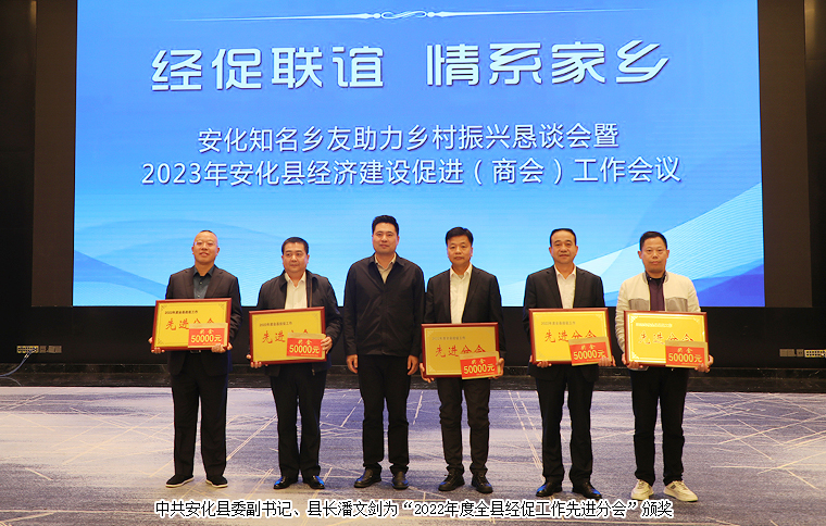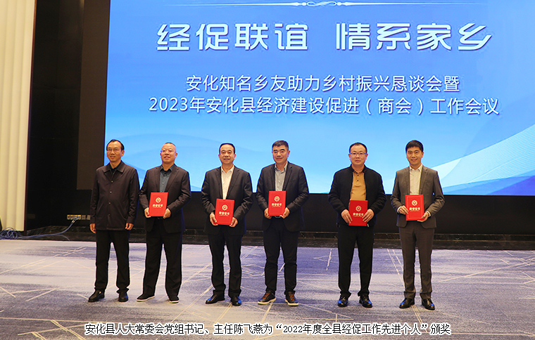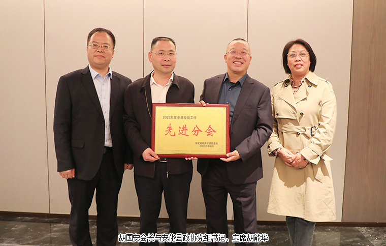 大會(huì)由安化縣政協(xié)黨組書記、主席胡能華主持。中共安化縣委常委、常務(wù)副縣長謝可贊宣讀《關(guān)于“迎老鄉(xiāng)回故鄉(xiāng)建家鄉(xiāng)”突出貢獻(xiàn)先進(jìn)個(gè)人的通報(bào)》《關(guān)于表彰 2022 年度先進(jìn)分會(huì)和個(gè)人的通報(bào)》。與會(huì)領(lǐng)導(dǎo)為獲獎(jiǎng)的先進(jìn)單位及個(gè)人頒獎(jiǎng)。憑借著在過去一年中在全縣經(jīng)促工作中的突出表現(xiàn),胡國安會(huì)長被評(píng)為“2022年度全縣經(jīng)促工作先進(jìn)個(gè)人”,長沙市安化商會(huì)被評(píng)為“2022年度全縣經(jīng)促工作先進(jìn)分會(huì)”。