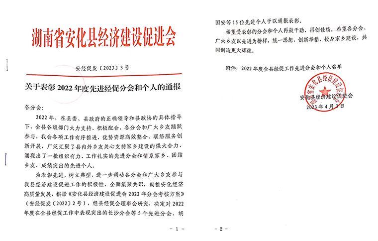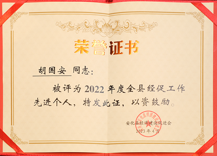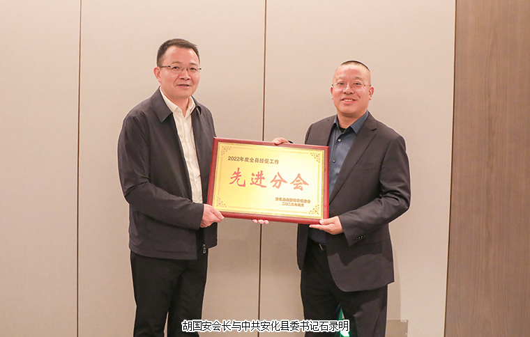 胡國安會(huì)長表示,此次被評(píng)為“2022年度全縣經(jīng)促工作先進(jìn)個(gè)人”,既是一份榮譽(yù),更是一份沉甸甸的責(zé)任。作為一名從安化大山深處走出來的企業(yè)家,他深知積極投資家鄉(xiāng),建設(shè)家鄉(xiāng),是自己與生俱來的責(zé)任與使命。多年來,他帶領(lǐng)企業(yè)綠之韻集團(tuán)先后在湖南益陽投資建設(shè)中藥材種植生產(chǎn)基地、在湖南安化投資建設(shè)黑茶種植生產(chǎn)基地。2022年5月,綠之韻公益基金會(huì)向湖南省慈善總會(huì)捐贈(zèng)200萬愛心款項(xiàng),專項(xiàng)用于鄉(xiāng)村振興項(xiàng)目。并與安化胡家村等6個(gè)村落簽訂結(jié)對(duì)幫扶協(xié)議,攜手村企共建,助力鄉(xiāng)村產(chǎn)業(yè)振興。6月,綠之韻與安化縣長吉中藥材合作社達(dá)成以黃精種植為依托的產(chǎn)學(xué)研基地戰(zhàn)略合作意向。7月,綠之韻與安化縣工商聯(lián)簽訂《幫扶鄉(xiāng)村振興重點(diǎn)縣戰(zhàn)略協(xié)議》。2023年3月,捐資100萬在安化冷市鎮(zhèn)開展“鄉(xiāng)村愛心書屋”建設(shè)并設(shè)立“綠韻圓夢獎(jiǎng)學(xué)金”。截至目前,綠之韻支援安化的足跡遍布安化高明鄉(xiāng)、古樓鄉(xiāng)、冷市鎮(zhèn)、江南鎮(zhèn)、煙溪鎮(zhèn)等地,項(xiàng)目涉及賑災(zāi)濟(jì)困、興教助學(xué)、孤殘救助、醫(yī)療衛(wèi)生、修路飲水、養(yǎng)老醫(yī)療、中藥材種植加工等,累計(jì)向安化縣捐贈(zèng)款物近700萬元,參與各類社會(huì)公益事業(yè)累計(jì)捐贈(zèng)款物7600多萬元。作為安化縣經(jīng)濟(jì)建設(shè)促進(jìn)會(huì)長沙分會(huì)理事長(長沙市安化商會(huì)會(huì)長),未來他將牢固樹立崇高的使命感和強(qiáng)烈的責(zé)任心,將自身及企業(yè)的發(fā)展同家鄉(xiāng)的經(jīng)濟(jì)社會(huì)發(fā)展緊密結(jié)合,與商會(huì)各位優(yōu)秀的企業(yè)家一起認(rèn)真盡責(zé)履職,積極為家鄉(xiāng)發(fā)展建言獻(xiàn)策,助力家鄉(xiāng)鄉(xiāng)村振興。同時(shí),依托經(jīng)促會(huì)、商會(huì)優(yōu)勢加強(qiáng)多方交流,搭建好在外游子與家鄉(xiāng)溝通的平臺(tái)與橋梁,凝聚更多的資源和力量,用切實(shí)的行動(dòng)帶動(dòng)更多的安化籍企業(yè)家助力家鄉(xiāng)建設(shè),為助力安化高質(zhì)量發(fā)展作出新的更大貢獻(xiàn)。