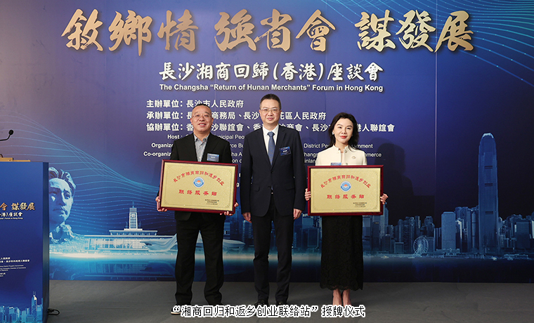 以鄉(xiāng)情為紐帶,以產(chǎn)業(yè)為依托,本次座談會重在“小而精”、“點對點”招商,重點突出現(xiàn)代服務(wù)業(yè)、科技、金融、文化旅游等產(chǎn)業(yè)的合作。座談會上,長沙市商務(wù)局、雨花區(qū)分別作市情、區(qū)情推介。為更好發(fā)揮商會在招商引資工作中的橋梁與紐帶作用,座談會現(xiàn)場,長沙市人民政府副市長、市工商聯(lián)主席康鎮(zhèn)麟為香港長沙聯(lián)誼會、長沙內(nèi)地港人聯(lián)誼會授牌“湘商回歸和返鄉(xiāng)創(chuàng)業(yè)聯(lián)絡(luò)站”。聯(lián)絡(luò)站將主動對接粵港澳朋友圈,搭建湘籍企業(yè)家溝通、交流、回鄉(xiāng)的橋梁,推動長沙與粵港澳大灣區(qū)湘商企業(yè)家的深度交流與合作?!跋愀坶L沙聯(lián)誼會將積極發(fā)揮引領(lǐng)和示范作用,引導(dǎo)和帶動粵港澳大灣區(qū)‘骨干’企業(yè)投資長沙?!毕愀坶L沙聯(lián)誼會名譽會長、綠之韻集團董事長胡國安表示,聯(lián)誼會將助力推進湘商產(chǎn)業(yè)回歸、資本回流、項目回投、人才回聚、總部回建。