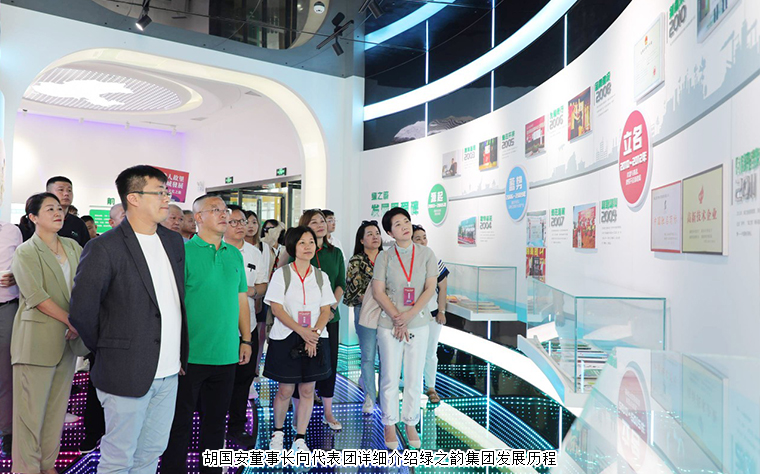胡國(guó)安董事長(zhǎng)對(duì)香港議員團(tuán)一行的到來(lái)表示熱烈歡迎,在綠之韻國(guó)際會(huì)議中心展廳,他向代表團(tuán)一行詳細(xì)介紹了綠之韻集團(tuán)的發(fā)展歷程、生產(chǎn)規(guī)模、產(chǎn)品研發(fā)、公益慈善、榮譽(yù)成果、未來(lái)發(fā)展規(guī)劃等板塊工作。在產(chǎn)品及公益展示區(qū)域,代表團(tuán)們表現(xiàn)出濃厚興趣。胡國(guó)安董事長(zhǎng)重點(diǎn)介紹,綠之韻自創(chuàng)立以來(lái),始終堅(jiān)持“以產(chǎn)品為導(dǎo)向”的發(fā)展理念,不斷加大科研投入,深化“產(chǎn)學(xué)研”合作,通過“自研”和“產(chǎn)學(xué)研”雙引擎,不斷強(qiáng)化產(chǎn)品線的科研攻關(guān),夯實(shí)企業(yè)產(chǎn)品核心競(jìng)爭(zhēng)力,結(jié)合科技的力量,綠之韻的產(chǎn)品不斷升級(jí),更迭換代。產(chǎn)品質(zhì)量越來(lái)越有保障,功能越來(lái)越多樣,在綠色可持續(xù)發(fā)展之路上穩(wěn)步前進(jìn),打造了一條專屬自身的“精品生產(chǎn)線”。他表示,在振興實(shí)業(yè)的同時(shí),公司堅(jiān)持積極承擔(dān)企業(yè)公民責(zé)任,先后開展了援建希望學(xué)校、綠韻圓夢(mèng)?書香助學(xué)、綠跑公益計(jì)劃、關(guān)愛貧困母親、樹人行動(dòng)、綠+兒童關(guān)愛等一系列飽含溫度的公益活動(dòng),影響和帶動(dòng)了數(shù)以萬(wàn)計(jì)的人和綠之韻一起,給予需要幫助的人送去愛、希望和力量。