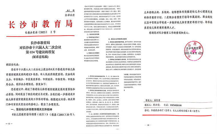 幼兒健康不僅關(guān)系到國民體質(zhì)健康和人的全面發(fā)展,更是關(guān)系到整個家庭的幸福。胡國安代表自提出《關(guān)于推進我市幼兒體育教育健康發(fā)展》的建議以來,多次親自率領(lǐng)團隊深入長沙師范學院就學前體育教師教育和幼兒體育事業(yè)發(fā)展進行調(diào)查研究。2022年9月16日,胡國安代表通過綠之韻公益基金會捐資40萬元與長沙師范學院共建湖南省幼兒體質(zhì)健康促進研究院,助力省市幼兒體質(zhì)健康促進事業(yè)發(fā)展。