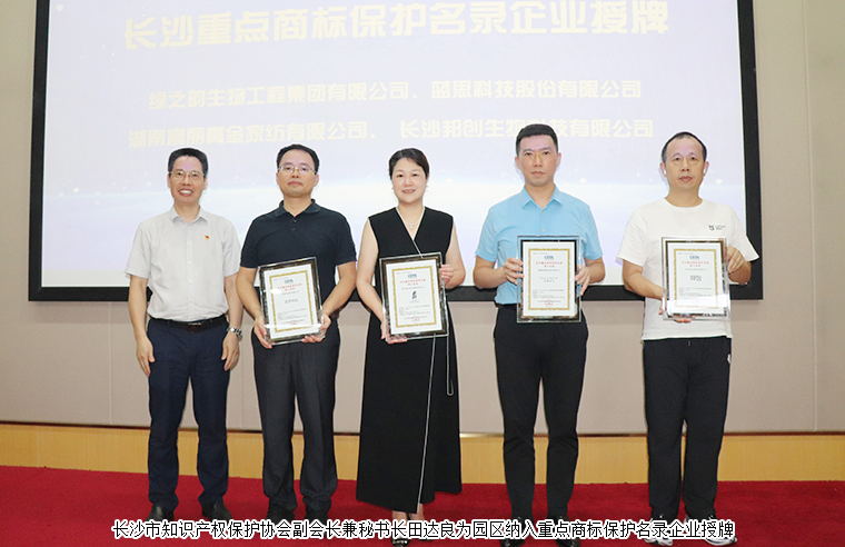 隨后,長(zhǎng)沙市知識(shí)產(chǎn)權(quán)保護(hù)協(xié)會(huì)副會(huì)長(zhǎng)兼秘書(shū)長(zhǎng)田達(dá)良為園區(qū)納入重點(diǎn)商標(biāo)保護(hù)名錄企業(yè)授牌。綠之韻集團(tuán)申報(bào)的“綠之韻”商標(biāo)成功入選2023年首批長(zhǎng)沙重點(diǎn)商標(biāo)保護(hù)名錄。據(jù)了解,此次重點(diǎn)保護(hù)商標(biāo)評(píng)選有著非常嚴(yán)苛的標(biāo)準(zhǔn),通過(guò)行業(yè)協(xié)會(huì)、專家組評(píng)審、商保委審議等層層篩選,要求品牌享有較高知名度,具有一定市場(chǎng)影響力、商標(biāo)價(jià)值較高等,旨在為品牌建設(shè)工作提供有力保障。