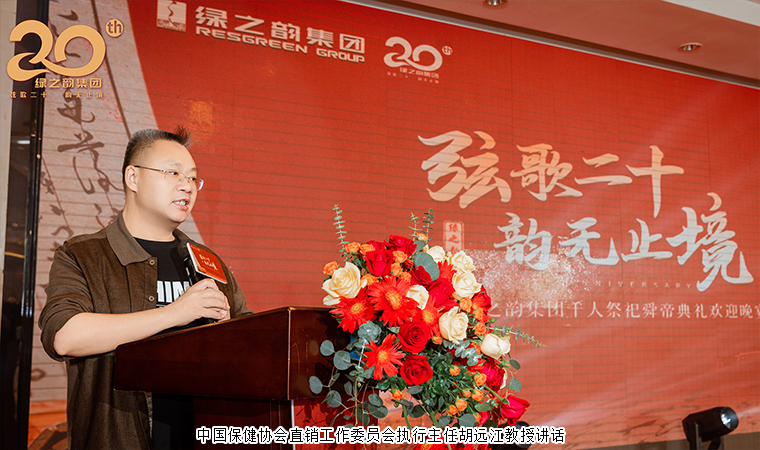 中國保健協(xié)會直銷工作委員會執(zhí)行主任胡遠江教授在晚宴現(xiàn)場講話。他表示非常榮幸今天能相聚在郴州,在這里感受到全面的養(yǎng)生文化,領略到東江的美食,感受生命的激情飛揚。飲水思源方能繼往開來,心系蒼生必然傳承流遠,中華民族自古以來都有緬懷先輩的傳統(tǒng),祭祀活動作為綠之韻集團二十周年盛典的重要系列活動之一,能感受到公司對人文先祖無限的敬仰,同時也彰顯了在這20年發(fā)展歷程中,集團公司文化力量和成長力量的凝聚。他相信未來的20年,綠之韻集團也一定會越飛越高,越飛越精彩。