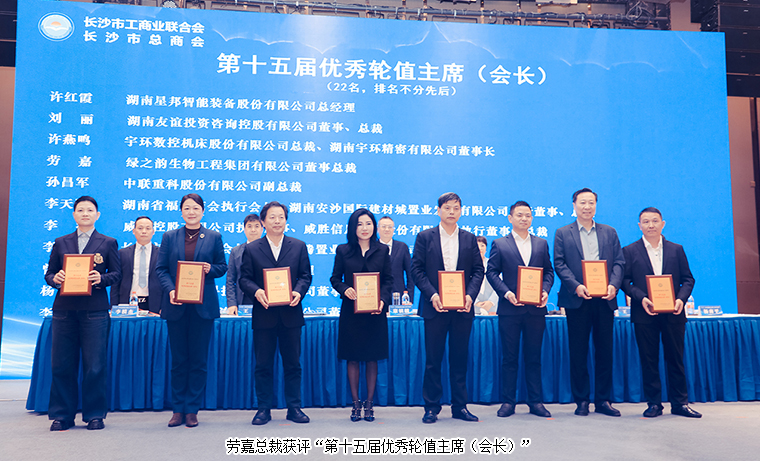 會議集中表彰了一批優(yōu)秀個人、企業(yè)和商會。胡國安董事長作為湖南省長沙市光彩事業(yè)基金會理事長,帶領(lǐng)綠之韻集團在推動企業(yè)高質(zhì)量發(fā)展的同時,以高度的責(zé)任感和使命感,積極投身鄉(xiāng)村振興、愛心助學(xué)等公益事業(yè),在光彩事業(yè)工作中表現(xiàn)突出并做出重要貢獻,綠之韻集團被長沙市工商業(yè)聯(lián)合會(總商會)授予“光彩事業(yè)先進民營企業(yè)”稱號。根據(jù)輪值會長的日??记诤蛯n}活動履職情況,經(jīng)過推薦和評選,勞嘉總裁等22名企業(yè)家副主席(副會長)被評為長沙市工商業(yè)聯(lián)合會(總商會)第十五屆優(yōu)秀輪值主席(會長)。