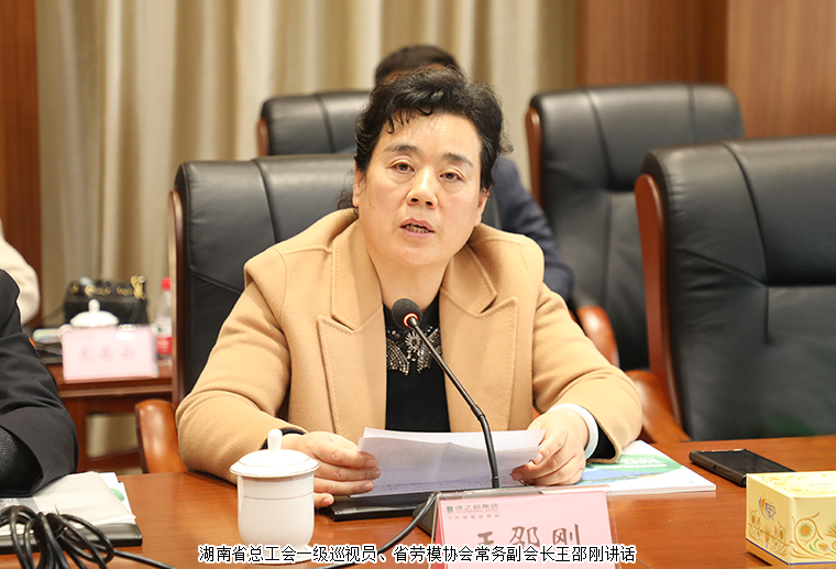 湖南省總工會一級巡視員、省勞模協(xié)會常務副會長王邵剛講話。她表示,習近平總書記在2020年全國勞動模范和先進工作者表彰大會上指出,“勞動模范是民族的精英、人民的楷模,是共和國的功臣。我國是人民當家作主的社會主義國家,黨和國家始終堅持全心全意依靠工人階級方針,始終高度重視工人階級和廣大勞動群眾在黨和國家事業(yè)發(fā)展中的重要地位,始終高度重視發(fā)揮勞動模范和先進工作者的重要作用?!眲谀R恢痹谔嵘袠I(yè)的形象方面發(fā)揮著重要作用,我們要加強勞模的聯(lián)系,勾起一張橫向到面、縱向到底的網(wǎng)絡,增強勞模之間的交流與溝通;要做好勞模的宣傳工作,宣傳勞模工作敬業(yè)、無私奉獻的精神和勞模的技能;要發(fā)揮勞模本身的榜樣力量,引領更多的人在工作中追求卓越,不斷超越自己;要落實勞模待遇,為勞模辦實事、做好事、解難事,將組織的溫暖關懷落到實處;要大力弘揚工匠精神,當好促進經(jīng)濟社會發(fā)展的主力軍,讓勞動光榮、創(chuàng)造偉大成為鏗鏘的時代強音,讓勞動崇高、勞動美麗在全社會蔚然成風。