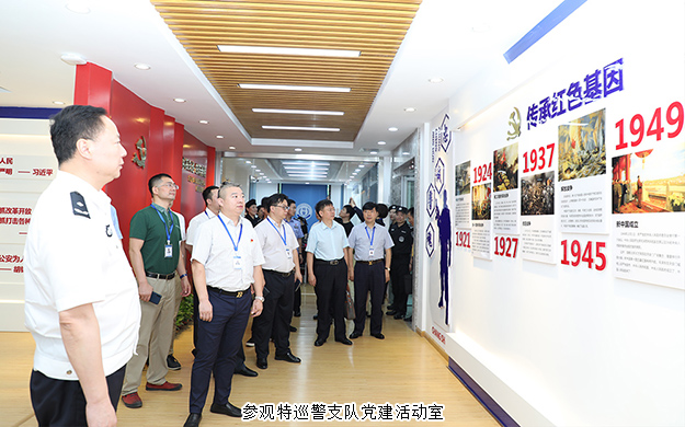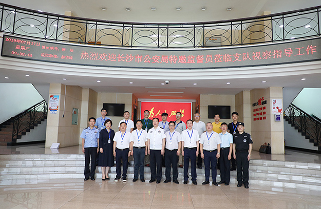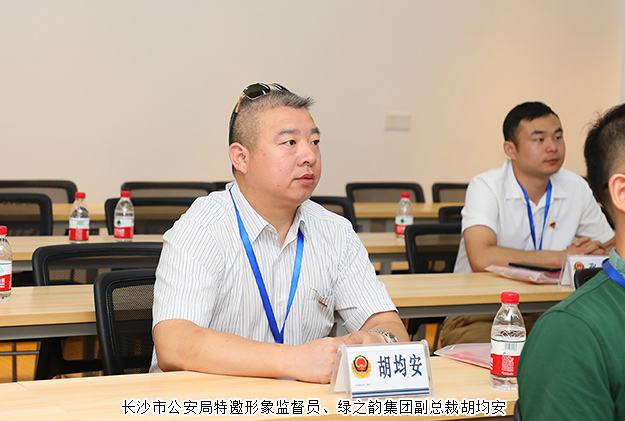 2019年7月17日,長(zhǎng)沙市公安局特邀形象監(jiān)督員、綠之韻集團(tuán)副總裁胡均安陪同長(zhǎng)沙市公安局黨委委員、副局長(zhǎng)徐波躍,黨委委員、政治部主任陳定佳;特巡警支隊(duì)黨委書記、支隊(duì)長(zhǎng)歐陽偉沙,市公安局機(jī)關(guān)紀(jì)委書記王海清等一行赴長(zhǎng)沙市公安局特巡警支隊(duì)調(diào)研。