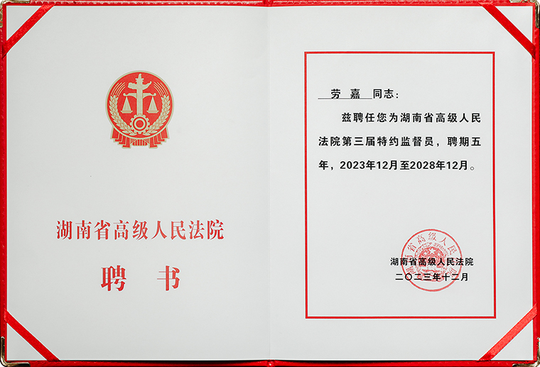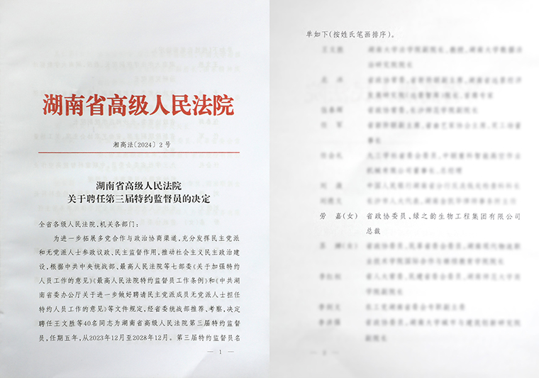 2024年3月21日,湖南省高級(jí)人民法院舉行第三屆特約監(jiān)督員聘任儀式。湖南省高級(jí)人民法院黨組書記、院長朱玉出席會(huì)議并講話,為特約監(jiān)督員代表頒發(fā)聘書。湖南省高級(jí)人民法院黨組副書記、副院長鄔文生主持會(huì)議。中共湖南省委統(tǒng)戰(zhàn)部副部長廖建華出席會(huì)議并講話。中共湖南省委政法委二級(jí)巡視員羅壽初,省人大監(jiān)察和司法委員會(huì)副主任委員段成鋼,省政協(xié)社會(huì)和法制委員會(huì)駐會(huì)副主任楊天兵出席會(huì)議。湖南省高級(jí)人民法院黨組成員、政治部主任李知文宣讀聘任決定。湖南省政協(xié)委員、綠之韻集團(tuán)總裁勞嘉等40名同志被聘為湖南省高級(jí)人民法院第三屆特約監(jiān)督員。