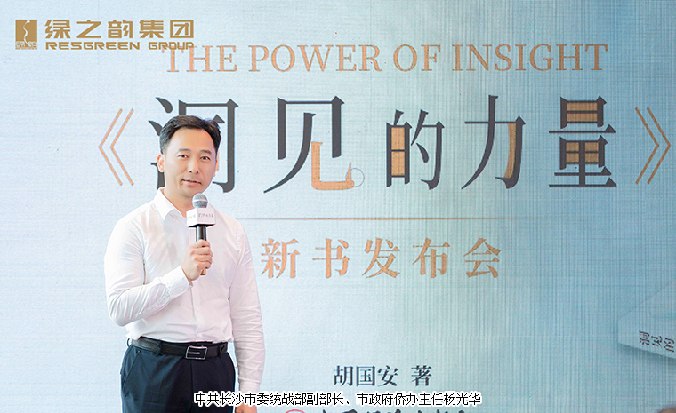 隨后,《洞見的力量》新書發(fā)布儀式啟動。長沙市人大常委會副主任李偉群,中共長沙市委統(tǒng)戰(zhàn)部副部長、市政府僑辦主任楊光華,長沙市雨花區(qū)人大常委會黨組書記、主任馮聰龍,長沙市雨花區(qū)委常委、宣傳部部長劉江紅,著名戰(zhàn)略研究專家、北大、清華新營銷總裁高級研修班特邀授課導師胡遠江,綠之韻集團董事長胡國安站在啟動臺前,共同見證新書的隆重首發(fā)。楊光華部長在講話中表達了對胡國安董事長的祝賀。他表示,《洞見的力量》在世界讀書日發(fā)布,意義深遠。會前我快速通讀此書,非常感動,胡國安先生不僅把企業(yè)做大做好,把學習和生活也經營的很好。他不僅是一位優(yōu)秀的企業(yè)家,更是一位豐富的思想者,還是一個非常勤奮的筆耕者?!抖匆姷牧α俊废蛭覀冎v述了民營企業(yè)走向成功的十二大發(fā)展引擎:初心、文化、黨建、責任、學習、產品、科研、人才、誠信、感恩、公益和夢想。詳細全面的向我們展示了胡國安先生從創(chuàng)業(yè)到勇擔社會責任一路走來的心路歷程,他對企業(yè)的管理、對人生的感悟、對團隊的塑造、對文化的理解,匯聚成一種格局和力量,這種格局是胸懷國家民主的,是胸懷社會蒼生的,釋放出精神的力量、信仰的力量和文化的力量。今天的發(fā)布會,不僅讓我們看到綠之韻的文化和傳承,也感受到創(chuàng)新和智慧,相信這本書能夠給大家?guī)硭伎己透形?,收獲創(chuàng)業(yè)的智慧和成長的力量,開創(chuàng)出更加美好的明天。