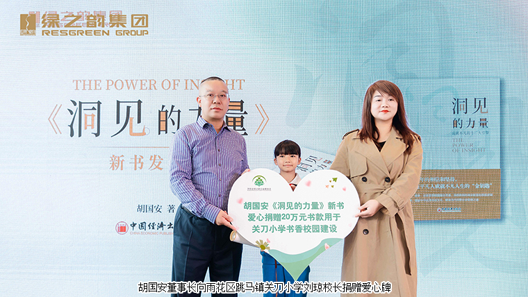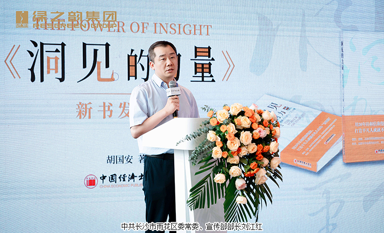 發(fā)布會由長沙廣播電視臺主持人袁靜怡主持。中共長沙市雨花區(qū)委常委、宣傳部部長劉江紅在致辭中表達了對《洞見的力量》新書發(fā)布的祝賀與期待。他表示,《洞見的力量》這本書,生動記述了胡國安先生在其創(chuàng)立的企業(yè)發(fā)展各階段的心路歷程,展現了其事業(yè)發(fā)展的十二大引擎和樸素愿景,凝練了其對當代民營企業(yè)管理的獨到見解,葆有著深切淳厚的人文思索和經世致用的哲學思考,具有很強的思想性、啟發(fā)性和可讀性,對民營企業(yè)發(fā)展具有很強的借鑒意義。胡國安先生是一位極具使命責任和人格魅力的企業(yè)家,善學習、勇擔當、敢創(chuàng)新、有愛心。由胡國安先生投資20億元興建的綠之韻中心坐落雨花區(qū),作為雨花人,我們感受到綠之韻勇往直前的意志力和向善力。前幾天,胡國安先生當選了湖南省長沙市光彩事業(yè)基金會第三屆理事會理事長,捐款了210萬用于公益慈善事業(yè),今天的發(fā)布會胡董又捐贈了20萬用于雨花區(qū)書香校園建設工作。希望有更多像胡國安先生這樣有責任和情懷的企業(yè)家們,投資雨花、扎根雨花、建設雨花,求發(fā)展、謀共贏、共成長。開放雨花,夢想直達,全民閱讀,共筑美好,一起來遇見美好的自己,一起來看更廣闊的世界。