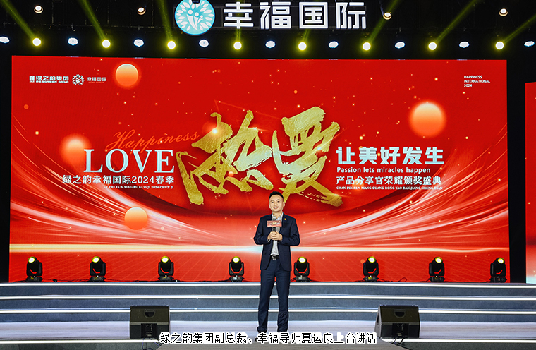 在活動(dòng)接近尾聲之時(shí),綠之韻集團(tuán)副總裁、幸福導(dǎo)師夏運(yùn)良上臺(tái)講話。他向大會(huì)現(xiàn)場(chǎng)以及通過直播互動(dòng)視頻觀看本次大會(huì)盛況的綠之韻幸福國際家人們致以熱烈的歡迎和誠摯的問候,并向每一位獲獎(jiǎng)?wù)弑硎緹崃业淖YR。他表示,今天大會(huì)的主題是熱愛,讓美好發(fā)生。今天站在舞臺(tái)的將近900位產(chǎn)品分享官、每一位戰(zhàn)隊(duì)長(zhǎng)和戰(zhàn)隊(duì)代表、所有分享者,以及全新亮相的五大市場(chǎng)的核心管理團(tuán)隊(duì)已經(jīng)很好地詮釋了這個(gè)主題,在2024年第一季度的戰(zhàn)斗中,你們用熱愛創(chuàng)造了一個(gè)美好的奇跡。什么是熱愛?一個(gè)真正熱愛事業(yè)的人,他們會(huì)有強(qiáng)大的內(nèi)在動(dòng)力;會(huì)有超強(qiáng)的抗壓能力;他們有著高效的時(shí)間管理和效率;他們善于創(chuàng)造勇于承擔(dān);他們自身有滿滿的成就感和幸福感。熱愛是綠之韻幸福國際能一直走上坡路的燈塔。從綠之韻幸福國際成立那一天起,科技讓中醫(yī)養(yǎng)生進(jìn)萬家,就是我們奮斗的燈塔。因?yàn)闊釔?,我們傳承和?chuàng)新老祖宗的中醫(yī)智慧,做一款讓世界更美好的產(chǎn)品,幫助更多人收獲健康;因?yàn)闊釔?,我們讓幸福國際成為一個(gè)長(zhǎng)久、安全、穩(wěn)健的創(chuàng)業(yè)平臺(tái),讓幸福代言人能夠擁有低門檻就業(yè)、創(chuàng)業(yè)的機(jī)會(huì);因?yàn)闊釔?,我們?huì)努力,成為一群靠譜的人,讓美好在對(duì)的時(shí)間都能如約而至。感謝每一位熱愛著產(chǎn)品、熱愛著綠之韻幸福國際的你們,我會(huì)竭盡全力,為你們的熱愛保駕護(hù)航!