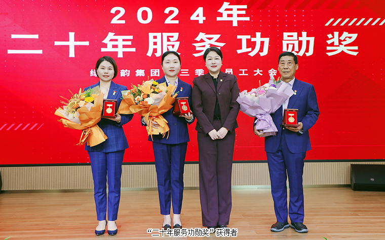 為表彰先進、樹立榜樣、激勵奮進,大會對2024年度“五年服務英才獎”、“十年服務忠誠獎”、“二十年服務功勛獎”進行了表彰,鼓勵全體員工以優(yōu)秀為標桿,勇于追求卓越,在工作中實現(xiàn)個人價值與奮斗目標。勞嘉總裁、胡均安常務副總裁依次為獲獎優(yōu)秀個人頒發(fā)榮譽獎杯和證書。獲獎代表王壯、黃茜發(fā)表獲獎感言,分享了他(她)們加入綠之韻的成長歷程,并表達了將始終保持積極進取的態(tài)度,珍惜榮譽、奮勇有為、不斷提升的決心。
