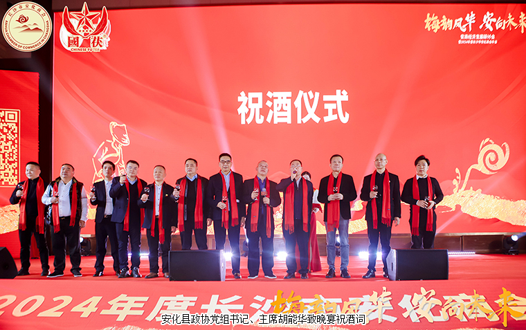 佳肴美酒賀新歲,暢敘鄉(xiāng)情共此時(shí)。當(dāng)晚,還舉行了2024年度長沙市安化商會(huì)年會(huì)。燈火輝煌的金色大廳里,華貴的吊燈灑下柔和的暖色光芒,映照著精美的食物和熱鬧的人群,整個(gè)會(huì)場(chǎng)成了匯聚歡樂的海洋,臺(tái)上載歌載舞,臺(tái)下觥籌交錯(cuò),笑容洋溢在每個(gè)人的臉上,一聲聲問候、一張張笑臉、一次次握手,無不訴說著大家對(duì)鄉(xiāng)情的深深眷戀。胡國安會(huì)長率商會(huì)成員登臺(tái),向全體與會(huì)人員送上祝福,大家邊敘鄉(xiāng)情邊飲美酒,歡聲笑語,其樂融融。難忘愉悅的今宵,期待美好的明天。相聚雖然短暫,鄉(xiāng)情記憶永恒。它是我們共同努力的見證,也是對(duì)未來的美好展望。愿我們帶著愉悅和感動(dòng)繼續(xù)前行,以更加昂揚(yáng)的姿態(tài)、更加務(wù)實(shí)的行動(dòng)、更加奮發(fā)的動(dòng)力,為長沙市安化商會(huì)發(fā)展開啟嶄新的輝煌篇章。