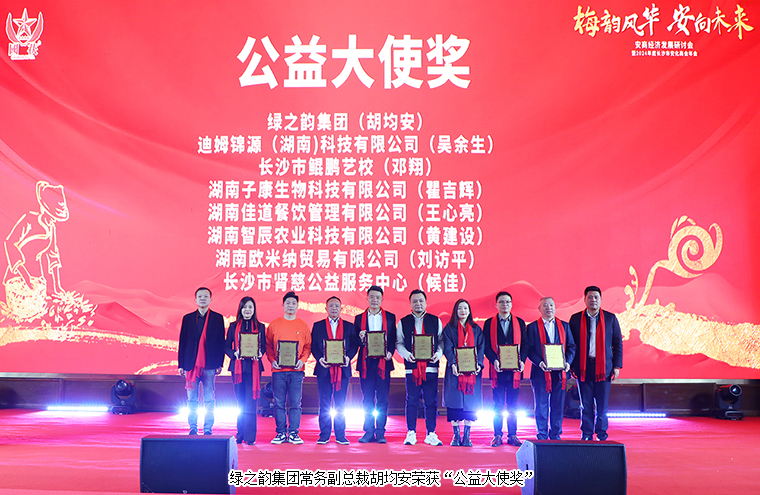 長沙市安化商會(huì)成立以來,不斷加強(qiáng)長沙、安化兩地聯(lián)絡(luò)和溝通,做好信息交流,并積極發(fā)展吸收優(yōu)秀的會(huì)員企業(yè)加入商會(huì)班組,壯大商會(huì)的實(shí)力,凝結(jié)安化籍企業(yè)家力量,取得明顯發(fā)展成果。為了表彰為安化發(fā)展做出貢獻(xiàn)的會(huì)員代表,大會(huì)相繼頒發(fā)了“優(yōu)秀會(huì)長獎(jiǎng)”、“優(yōu)秀理事獎(jiǎng)”、“優(yōu)秀黨員獎(jiǎng)”、“公益大使獎(jiǎng)”、“特殊貢獻(xiàn)獎(jiǎng)”等獎(jiǎng)項(xiàng)。綠之韻集團(tuán)積極投身社會(huì)公益事業(yè),帶領(lǐng)安化籍企業(yè)家回鄉(xiāng)考察交流;回報(bào)桑梓,踴躍參與家鄉(xiāng)各項(xiàng)公益活動(dòng),給鄉(xiāng)親送溫暖,為鄉(xiāng)村振興工作貢獻(xiàn)力量。安化縣人大代表、益陽市工商聯(lián)(總商會(huì))副會(huì)長、綠之韻集團(tuán)常務(wù)副總裁胡均安榮獲“公益大使獎(jiǎng)”。