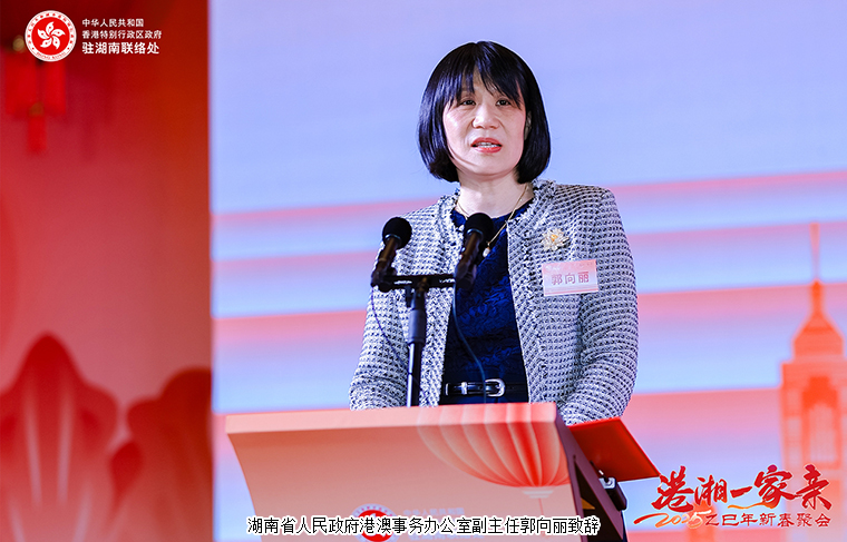 湖南省人民政府港澳事務(wù)辦公室副主任郭向麗向出席嘉賓送上新春祝福并代表湖南省人民政府港澳事務(wù)辦公室向香港各界的朋友致以熱烈的歡迎,向長期以來關(guān)心和支持湖南發(fā)展的各界人士致以衷心的感謝。她表示,自改革開放以來,兩地經(jīng)濟(jì)文化交流頻繁,香港企業(yè)家在湖南投資興業(yè),湖南企業(yè)也通過香港資本市場發(fā)展壯大。近年來,兩地貿(mào)易額顯著增長,文化教育交流日益密切,香港青年在湖南學(xué)習(xí)紅色精神,湖南學(xué)子通過游學(xué)計(jì)劃走進(jìn)香港,文化紐帶進(jìn)一步拉近了兩地距離。當(dāng)前,湖南正全力打造國家重要支點(diǎn),香港則承擔(dān)著國家戰(zhàn)略中的重要使命,兩地在國家戰(zhàn)略布局中具有廣闊的合作空間。她希望香港朋友把握歷史機(jī)遇,與湖南攜手推進(jìn)經(jīng)貿(mào)、產(chǎn)業(yè)、科技、人文、綠色等多領(lǐng)域的合作,利用香港“一國兩制”的獨(dú)特優(yōu)勢,成為湖南連接世界的橋梁。最后,她以“恰同學(xué)少年,風(fēng)華正茂”詩句勉勵(lì)大家,共同為中華民族偉大復(fù)興貢獻(xiàn)力量,譜寫湘港合作的新篇章。