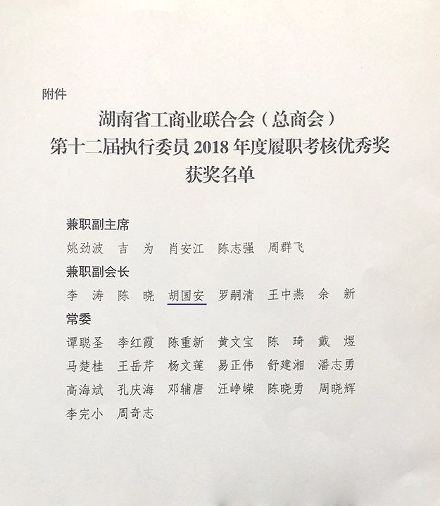 會議審議通過了《關(guān)于設(shè)立湖南省工商聯(lián)顧問委員會決定》,《湖南省工商聯(lián)(總商會)第十二屆執(zhí)行委員會第三次會議選舉辦法(草案),《湖南省工商聯(lián)(總商會)第十二屆執(zhí)行委員會第三次會議秘書長、常務(wù)委員侯選人名單》,《湖南省工商聯(lián)(總商會)第十二屆執(zhí)行委員會第三次會議替補(bǔ)執(zhí)行委員、常務(wù)委員侯選人名單》,通報(bào)表彰了2018年度執(zhí)行委員履職優(yōu)秀副主席、副會長、常委、執(zhí)委。胡國安董事長獲評2018年度履職優(yōu)秀副會長。