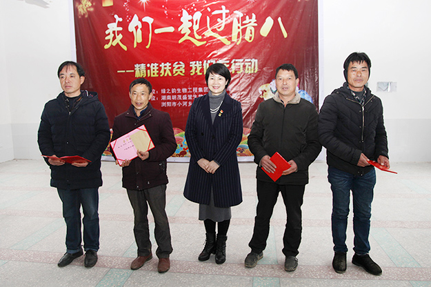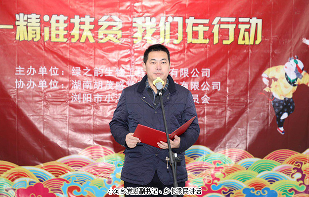 辭舊迎新,喜迎八方來賓;寒冬送暖,共助精準(zhǔn)扶貧。2018年1月24日,為了深入貫徹黨的十九大精神,扎實(shí)做好精準(zhǔn)扶貧工作,進(jìn)一步增進(jìn)幫扶企業(yè)和群眾之間的感情,在臘八節(jié)濃濃的節(jié)日氛圍中,由綠之韻集團(tuán)主辦、湖南胡茂盛堂生物科技有限公司和瀏陽市小河鄉(xiāng)烏石村協(xié)辦的“精準(zhǔn)扶貧,我們在行動”主題活動——烏石農(nóng)產(chǎn)品直購會和項(xiàng)目簽約啟動會成功舉行。小河鄉(xiāng)黨委副書記、鄉(xiāng)長梁民,瀏陽經(jīng)開區(qū)管委會紀(jì)檢監(jiān)察室主任助理鄧水平,烏石村村支部書記賴平;綠之韻集團(tuán)董事總裁、綠之韻公益基金會理事長勞嘉,綠之韻集團(tuán)黨委書記劉云、副書記許達(dá)仲一行,與烏石村黨員、群眾、村組干部等近百人參加此次活動。