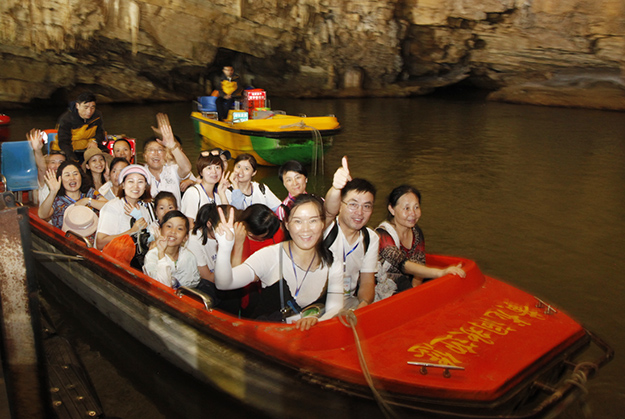 炙陽高照,黃龍洞自然空調(diào)帶來的清涼是送給伙伴們的第一份禮物。黃龍洞是“世界溶洞全能冠軍”,超過10萬平方米的龐大洞穴空間,立體的洞穴結(jié)構(gòu),高大的洞穴瀑布,寬闊的龍宮廳及數(shù)以萬計的石筍,仿佛一座神奇的地下“魔宮”。綠之韻家人們穿梭其中,無所不奇,無奇不有,深深陶醉在大自然神奇的懷抱里,驚嘆不已。