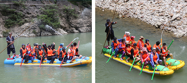 炎炎夏日,伙伴們對水的渴望更加強烈。張家界旅行的重頭戲便是前往素有“天下第一漂”美譽的猛洞河漂流,感受與水搏斗的激情和清涼。從“哈妮宮”出發(fā),順?biāo)拢蝗~扁舟,在原始次生林的高山峽谷之中,綠之韻營銷精英們身著救身衣、乘皮舟、闖險灘、博激流,沿途觀美景、沐瀑流、打水仗、過峽關(guān),出沒浪端谷底,激情高漲之時,忍不住放歌長嘯,戲水嘻鬧,找回快樂童真的自我。