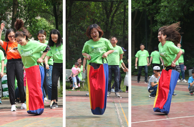 稍作整理后,活動組委會將所有參加活動的員工分成了六組,在六個小組間展開了別開生面、妙趣橫生的趣味競技活動。比賽還沒開始,各隊成員就摩拳擦掌,躍躍欲試?!按筇庇螒蛑?,家人們穿著“袋鼠裝”,哨聲一響,參賽隊員們使出了渾身解數(shù),有的步伐輕盈輕松而過,有的奮力跳躍磕磕絆絆,有的手忙腳亂摔倒在地……參賽的家人縱情投入,場邊的助威吶喊聲連同歡笑聲此起彼伏,不絕于耳,將活動推向一個又一個的高潮。