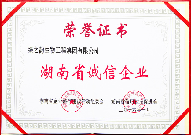 為樹立誠信標桿,弘揚誠信精神,推動我省誠信體系建設(shè),營造良好信用環(huán)境,在中共湖南省委宣傳部、湖南省工商行政管理局的支持和指導(dǎo)下,經(jīng)過湖南省企業(yè)誠信建設(shè)活動組委會和專家組歷時6個多月的嚴格評審及聲譽監(jiān)測,本著科學(xué)、務(wù)實、規(guī)范和公正、公平、公開的原則,綠之韻集團被湖南省企業(yè)誠信建設(shè)活動組委會、湖南省信用建設(shè)促進會聯(lián)合評定為“湖南省誠信企業(yè)”和“湖南省質(zhì)量服務(wù)百強品牌”。
