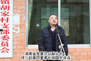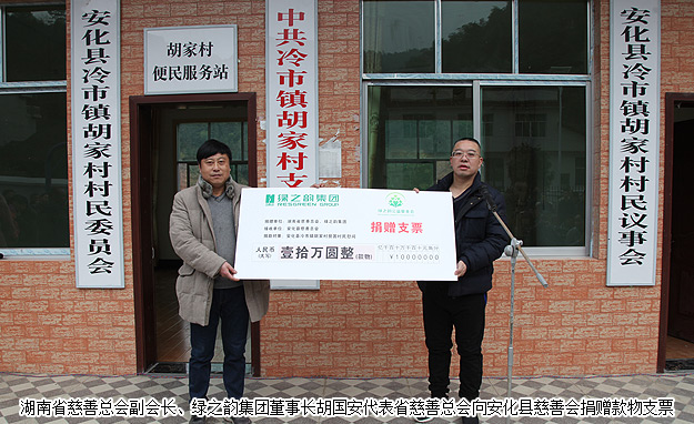 愛心慰問活動(dòng)上,安化縣政協(xié)主席李太源發(fā)表講話,對胡國安董事長致富思源、支援家鄉(xiāng)建設(shè)的高尚情操,對綠之韻集團(tuán)精準(zhǔn)扶貧、回報(bào)桑梓的大愛情懷表示高度的肯定和贊許;安化縣冷市鎮(zhèn)胡家村村支書胡利民簡單介紹了胡家村相關(guān)情況。湖南省慈善總會(huì)副會(huì)長、綠之韻集團(tuán)董事長胡國安代表湖南省慈善總會(huì)向安化縣慈善會(huì)捐贈(zèng)10萬元款物支票,中共安化縣委常委、政法委書記羅必勝向胡國安董事長頒發(fā)了愛心捐贈(zèng)證書。儀式上,湖南省慈善總會(huì)副會(huì)長、綠之韻集團(tuán)董事長胡國安發(fā)表了飽含真情的講話。他在發(fā)言中表示,“一個(gè)企業(yè)能夠受到政府的關(guān)心、贏得社會(huì)的信賴,獲得民眾的尊重,一定離不開對社會(huì)責(zé)任的思考、實(shí)踐和擔(dān)當(dāng)。安化胡家村是我的家鄉(xiāng),生我養(yǎng)我的熱土,生命之源,難忘之根。沒有胡家村,就沒有我,沒有綠之韻。我從這里的大山走出去,也想幫助更多人走出大山,過上幸??鞓返纳?。綠之韻公益基金會(huì)除了繼續(xù)幫扶家鄉(xiāng)建設(shè)水、電、道路和學(xué)校等基礎(chǔ)設(shè)施,還將進(jìn)一步推動(dòng)輸血式扶貧向造血式、“互聯(lián)網(wǎng)+三農(nóng)”扶貧模式轉(zhuǎn)變,盡最大努力幫助解決安化扶貧的實(shí)際困難,幫助家鄉(xiāng)困難群眾建立脫貧希望,尋找致富方法,使企業(yè)發(fā)展成果惠及更多鄰里鄉(xiāng)親們!”