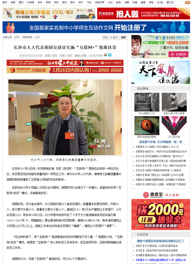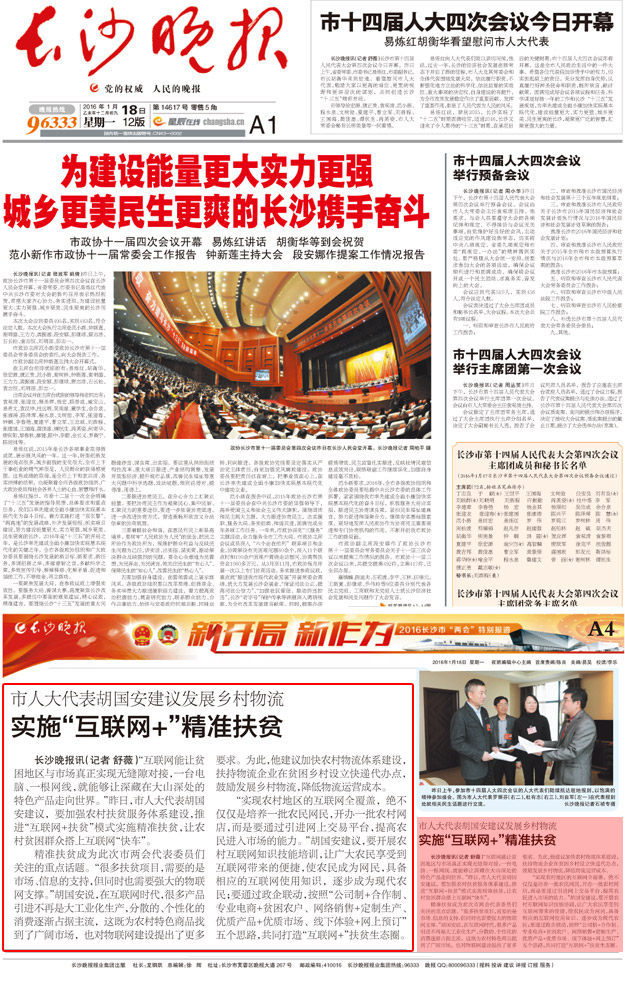 “今年的政府工作報(bào)告內(nèi)容豐富充實(shí),數(shù)據(jù)精準(zhǔn)翔實(shí),部分?jǐn)?shù)字還精確到個(gè)位,說明政府對完成目標(biāo)深有底氣。今年,我所提交的人大議案《關(guān)于推進(jìn)‘互聯(lián)網(wǎng)+扶貧’模式實(shí)施精準(zhǔn)扶貧的建議》和《關(guān)于大力發(fā)展鄉(xiāng)村物流的幾個(gè)建議》引起了與會(huì)代表和新聞媒體的廣泛關(guān)注,令我感到十分振奮?;ヂ?lián)網(wǎng)能讓貧苦地區(qū)與市場真正實(shí)現(xiàn)無縫隙對接,能夠讓深藏在大山深處的特色產(chǎn)品走向世界。政府要積極推進(jìn)互聯(lián)網(wǎng)+扶貧模式實(shí)施精準(zhǔn)扶貧,讓農(nóng)村貧苦群眾搭上‘互聯(lián)網(wǎng)+三農(nóng)’的快車。我對目前綠之韻集團(tuán)正在積極推進(jìn)的電子商務(wù)戰(zhàn)略規(guī)劃激情滿懷,信心百倍。綠之韻將緊緊依靠互聯(lián)網(wǎng)、移動(dòng)互聯(lián)網(wǎng)‘兩條腿’走路,構(gòu)建‘以京津唐’和‘湖南益陽’為南北基點(diǎn),以遍布全球的10000多家電子商務(wù)運(yùn)營中心為網(wǎng)絡(luò)的現(xiàn)代物流體系,打造國際一流的湖南本地電商企業(yè),為長沙實(shí)現(xiàn)‘率先建成全面小康、加快實(shí)現(xiàn)基本現(xiàn)代化’的總目標(biāo)不懈努力!”胡國安代表在接受騰訊網(wǎng)、長沙新聞?lì)l道、紅網(wǎng)、長沙政法頻道、長沙互動(dòng)頻道、長沙晚報(bào)、人大代表報(bào)、長沙市人民廣播電臺(tái)等多家媒體采訪時(shí),依然沉浸在政府工作報(bào)告的興奮之中。