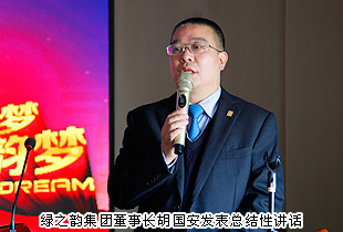 最后,綠之韻集團(tuán)胡國安董事長在全場熱烈的掌聲中走上講臺(tái)發(fā)表了重要講話。他首先向所有綠之韻員工一年來的辛勤付出表示誠摯的感謝。他指出,創(chuàng)立之初,綠之韻就將打造“最具幸福感、最受尊敬企業(yè)”作為行動(dòng)目標(biāo),竭力讓所有員工、經(jīng)銷商和企業(yè)不斷獲得成長,不斷取得成功,從而在綠之韻通往“百年企業(yè)、世界名牌”的恢弘征程中逐步實(shí)現(xiàn)員工夢(mèng)、經(jīng)銷商夢(mèng)和綠之韻夢(mèng),最終夢(mèng)想成真,共享精彩。他強(qiáng)調(diào),企業(yè)目標(biāo)就是實(shí)現(xiàn)其宗旨所要達(dá)到的預(yù)期成果,沒有目標(biāo)的企業(yè)是沒有希望的企業(yè)。企業(yè)目標(biāo)就是企業(yè)發(fā)展的終極方向,是指引企業(yè)航向的燈塔,是激勵(lì)企業(yè)員工不斷前行的精神動(dòng)力。接下來的2015年乃至未來3年,綠之韻將進(jìn)一步在企業(yè)文化、科學(xué)管理、人才培養(yǎng)、教育培訓(xùn)、產(chǎn)品研發(fā)等多個(gè)方面下大力氣、做足功夫。他希望每一位綠之韻人明確目標(biāo)、堅(jiān)定信心、對(duì)照承諾、團(tuán)結(jié)協(xié)作,充分發(fā)揮出自己的聰明才智,找準(zhǔn)位置,努力工作,為實(shí)現(xiàn)自己的夢(mèng)想,家族的榮耀和企業(yè)的輝煌而不懈奮斗!