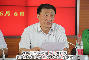 2014年6月6日,“關(guān)愛貧困母親,讓愛綻放”——中華慈善總會貧困母親救助綠之韻愛心行動第四站走進山東濰坊,現(xiàn)場為51名特困母親家庭捐贈10多萬元愛心善款。中華慈善總會募捐部主任蘇輝、貧困母親救助項目執(zhí)行主任陳富剛、濰坊市民政局局長吳海源、副局長劉好民等領(lǐng)導(dǎo)出席活動。綠之韻集團董事長胡國安、綠之韻集團全球營銷中心(中國區(qū))市場行政總監(jiān)梅其慧、市場業(yè)務(wù)總監(jiān)曹兵、山東分公司經(jīng)理伍成輝帶領(lǐng)張吉慶、朱建昌、張美華、范桂春、馬光錄、徐繼發(fā)、王占紅、申文高等綠之韻愛心志愿者為愛行動。