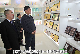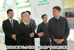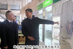 考察領(lǐng)導(dǎo)小組一行參觀了綠之韻集團(tuán)總部基地及產(chǎn)品展示廳,“綠色、天然、環(huán)保、健康、養(yǎng)生”的產(chǎn)品研發(fā)理念,以產(chǎn)、學(xué)、研結(jié)合為模式組建的產(chǎn)品科研團(tuán)隊(duì)都受到了安七一主席的充分肯定?!盀榱舜_保產(chǎn)品的品質(zhì),我們希望能夠更為全面的控制產(chǎn)品生物鏈上的所有環(huán)節(jié),包括原料、研發(fā)、生產(chǎn)和銷售,以打造綠之韻‘全產(chǎn)業(yè)鏈條’的產(chǎn)業(yè)結(jié)構(gòu)。先后與南京大學(xué)、湖南農(nóng)業(yè)大學(xué)、湖南中醫(yī)藥大學(xué)等科研機(jī)構(gòu)、院校展開戰(zhàn)略合作,全力打造‘產(chǎn)學(xué)研’成功合作典范。目前‘綠之韻’已被認(rèn)定為高新技術(shù)企業(yè),我們擁有五大生產(chǎn)基地,其中益陽萬畝中藥材種植基地,為我們的保健食品提供了優(yōu)質(zhì)的產(chǎn)品原料”,綠之韻集團(tuán)董事常務(wù)副總裁勞嘉向考察團(tuán)一行匯報(bào)。