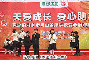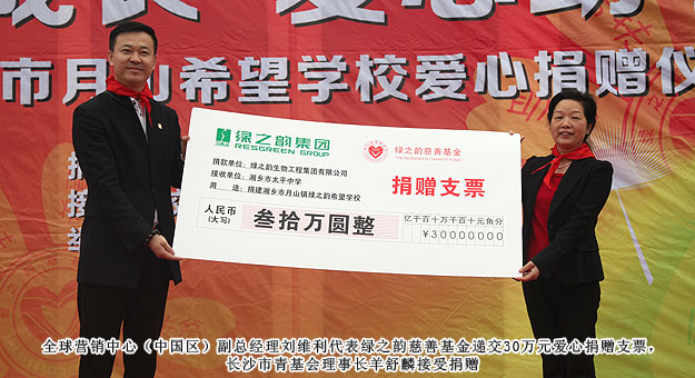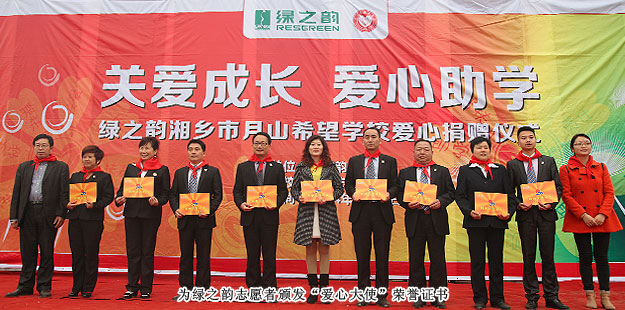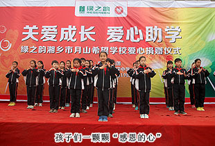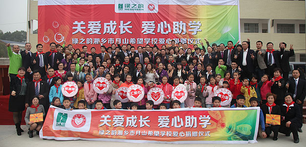 2014年3月19日,由共青團長沙市委、長沙市青基會牽頭,綠之韻集團出資30萬元建設的第九所希望學?!熬G之韻湘鄉(xiāng)市月山鎮(zhèn)希望學校”在湖南湘鄉(xiāng)市揭牌成立。共青團湘潭市委書記白云峰、共青團長沙市委副書記詹萍萍、湘鄉(xiāng)市人大常委會黨組副書記、副主任王建湘、長沙市青基會理事長羊舒麟、月山鎮(zhèn)常務副鎮(zhèn)長徐慧湘等十幾位領導嘉賓出席,綠之韻集團董事長胡國安、全球營銷中心(中國區(qū))副總經(jīng)理劉維利、湖南分公司經(jīng)理張薇與200多位綠之韻愛心經(jīng)銷商共同為愛傳承,為孩子們送上如春天般的融融暖意。
