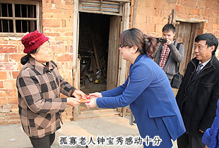 最后,慰問小組來到的是兩位孤寡老人家,他們分別是69歲的鐘寶秀和70多歲的老黨員黃軍輝。鐘寶秀老人,本是四口之家,奈何因家族性精神病史,丈夫與兩個兒子先后離世,讓她從此孤苦無依。黃軍輝老人則是一位老共產(chǎn)黨員,曾經(jīng)還是荷花片婦女主任,如今年年被評為村里的先進(jìn)分子。老人精神很好,向慰問組組員們一一道謝,還直言道:“你們又送錢又送東西,卻茶都不喝一口,這叫我怎么好意思!”
