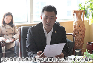 會上,綠之韻集團(tuán)總裁助理方彥雄組織全員學(xué)習(xí)了《中國共產(chǎn)黨第十八屆中央委員會第三次全體會議公報》原文,詳細(xì)介紹了十八屆三中全會召開的背景、時間、指導(dǎo)思想、總體目標(biāo)、重點(diǎn)任務(wù),進(jìn)一步明確了黨的十八屆三中全會是在我國改革開放新的重要關(guān)頭召開的一次重要會議,是全面深化改革的又一次總部署、總動員,具有重大而深遠(yuǎn)的影響。